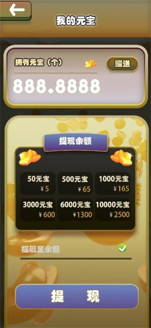 这款游戏能让你赚钱,具体是通过积累元宝然后提现的方式实现。游戏里有不少获取元宝的途径,等你攒够一定数量的元宝后,就可以点击“我的元宝”,接着挑选想要提现的金额——不同的提现金额对应的元宝消耗数量是不同的。只要你拥有了足够的元宝,点击提现后,钱就会立刻到账微信余额。