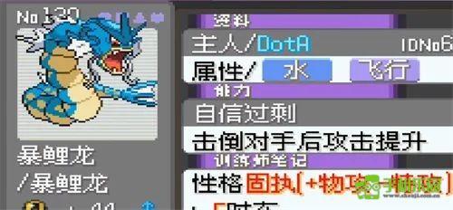 由鲤鱼王进化成的精灵,性格固执,特性是自信过剩。想要得到它的话,可以先去武斗镇的渔夫那里拿到低级钓竿,接着在周边的海域就能钓到鲤鱼王,等它到20级时就会进化为暴鲤龙。