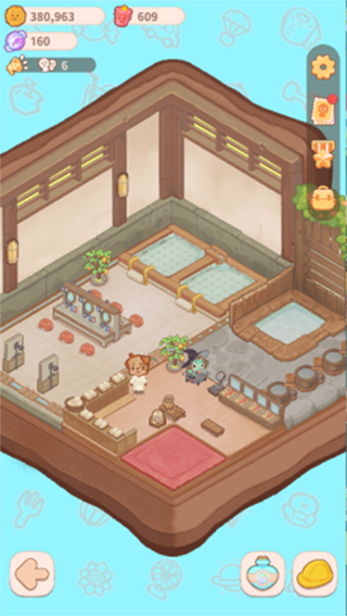 温泉区域配备了淋浴、温泉池、洗漱台、毛巾柜等日常设施。部分设施设有耐久值机制,当客人使用互动后,耐久值会相应减少,玩家可以通过点击操作来补充耐久值。