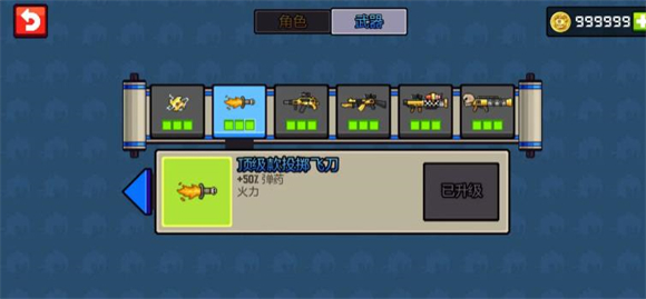 2、接着点击上方的武器按钮,就能对已获取的武器进行升级操作。建议优先升级前三把武器:手里剑、投掷飞刀和现代型步枪。这三把武器的出场率较高,当手里剑与投掷飞刀升至二级时,伤害和弹药量均可提升50%,这一数值远超其他武器;升至满级后,它们还会附加电属性与火属性效果,而步枪更是具备穿刺功能。