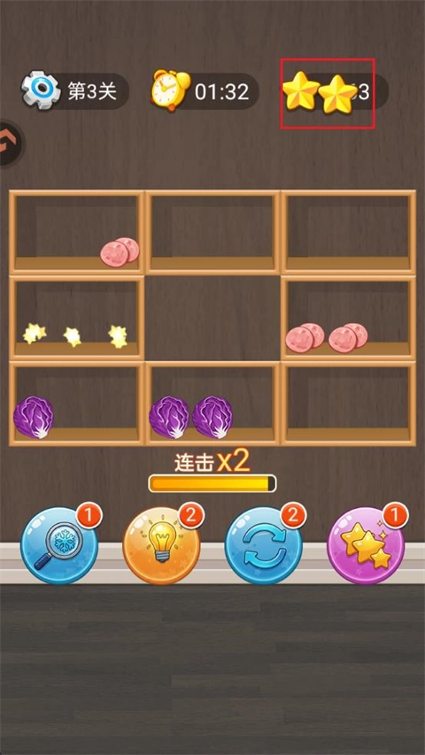 1、在本站安装招财进宝游戏,打开并进入游戏后,需在有限的收纳格内,把三种相同的食材连成一组来完成消除操作。