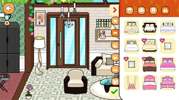 3、进入房间后,点击右上角的按钮就能进入装饰界面,在这个界面里你可以随意更换各类家具物品。