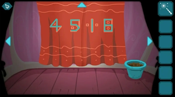 将窗帘关上,观察窗帘上的图案,结合墙壁上的图案,将两幅图重合的部分去掉,获得密码「4516」,输入密码打开椅子上的密码盒获得「橡皮擦」和「蜡笔」