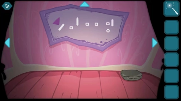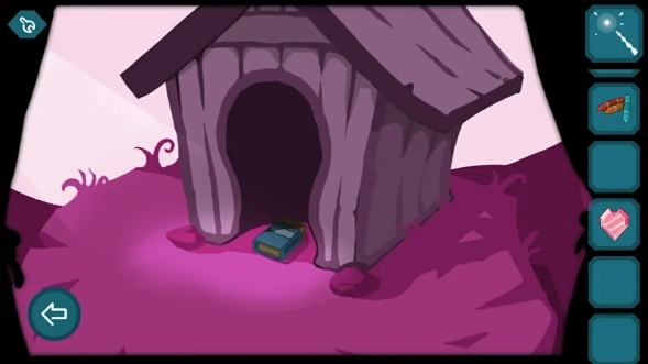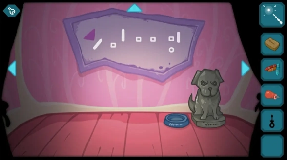 将熟肉放在狗狗的食盆里获得「黄色钥匙」,用橡皮擦擦掉墙上紫色的三角形图案后露出钥匙孔,插入黄色钥匙打开机关