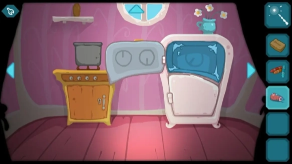 打开窗帘,拿走时钟上的「时针」,拿走桌子上的「蓝色钥匙」,用钥匙打开灶台下面的柜子获得「铃铛部件」,安上部件点击铃铛