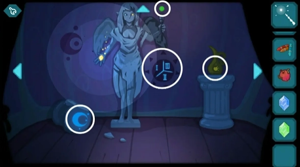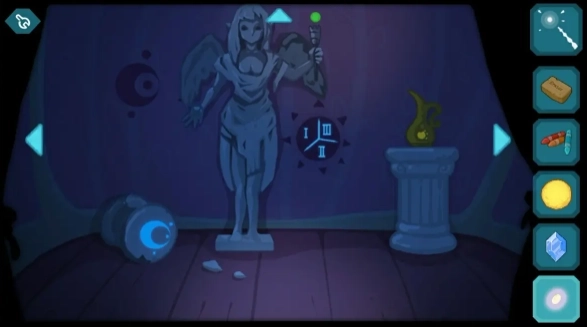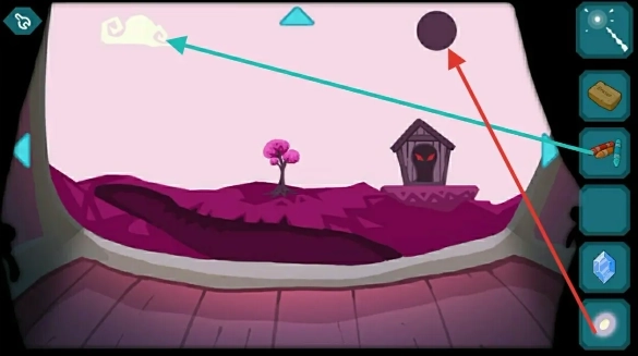 将时针装进时钟后拨到十二点获得「种子」,将种子种进花盆获得「太阳之眼」,用橡皮擦擦掉天花板的太阳让时间变成晚上,拿走报时鸟背后的「蓝色宝石」