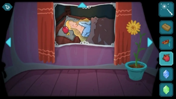 走到壁画跟前,把公主的毒苹果换下来,用蜡笔把月亮涂成太阳来切换到白天,从公主桌上取走「金币」(多拉动几次窗帘),把金币交给钓鱼的小孩就能得到「鱼竿」,再把时间切换到夜晚,用鱼竿获取「月亮之眼」