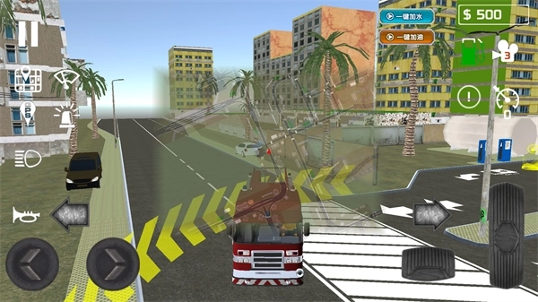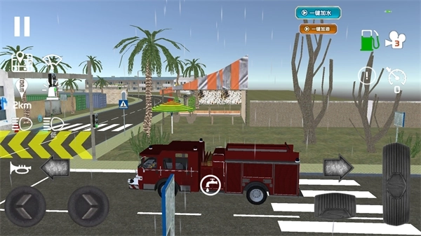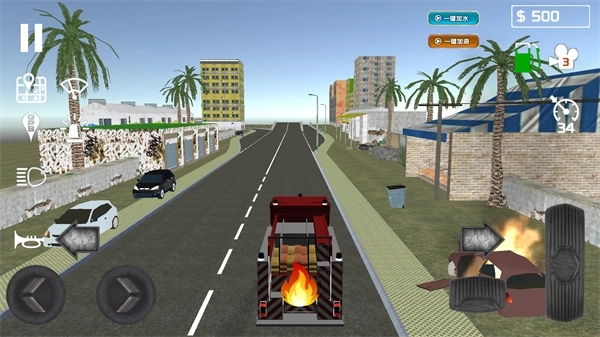 1、点击游戏主界面中央的方向盘按钮,就能开启消防车驾驶模式,承接各类灭火任务。