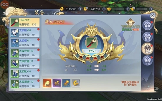 装备套装的名称序列为:套装(初始)、太极套装、飞天套装、达摩套装、天王套装、光魔套装。