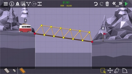 2、第二关提供了4个锚点,其中下方的两个锚点是用来搭桥架的。搭桥的顺序是先将桥面搭好,然后再用桥面中间的四个锚点和下方的两个锚点构成两个三角形桥架,即可将桥面中间部份牢固的托起了(该结构可顺利经受住卡车的通过试验)