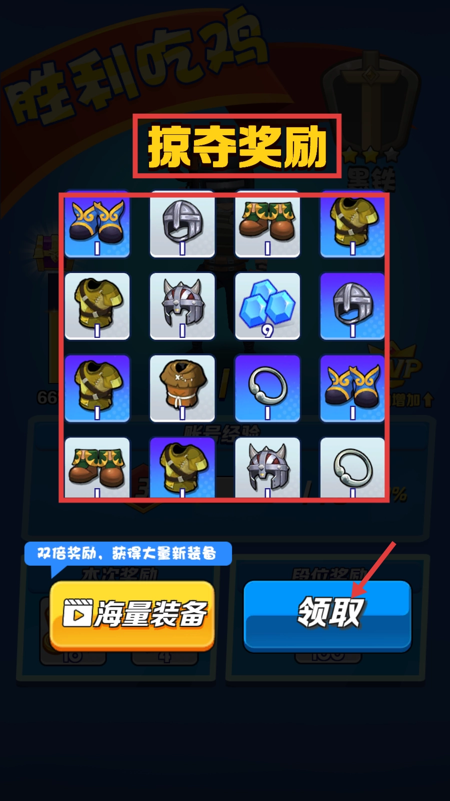 成功“吃鸡”后,你可以领取【掠夺奖励】,从而获得大量装备资源。此时,你有两个选择:一是观看广告来获取双倍奖励,二是直接点击【领取】按钮获取奖励。