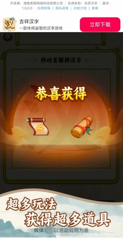 吉祥汉字游戏是海南类聚网络科技有限公司精心打造的2025年度全新休闲益智汉字闯关手机小游戏,现已惊喜上线!中国汉字博大精深,游戏以汉字为基础,设计了拆字组合等多样化玩法,等待你开启趣味闯关之旅。更有丰厚惊喜福利奖励,等你来挑战领取!