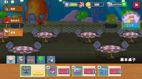 6、除了为海绵宝宝抽取服装,还能给派大星、章鱼哥、珊迪和蟹老板进行装扮,设计专属的美食餐厅以提升顾客的入场率