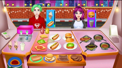 2、穿上你的烹饪围裙,准备在这个女孩的食品卡车游戏中烹饪甜甜圈和汉堡等一些很棒的食物;