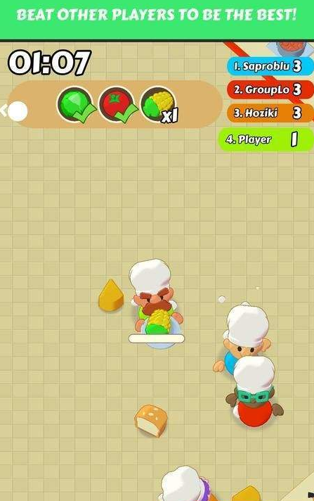 玩家成为一名厨师,必须手持盘子抓取地图上显示的各种食材,及时交付给顾客,完成订单以赚取积分,并在时间用完之前争夺最高分。